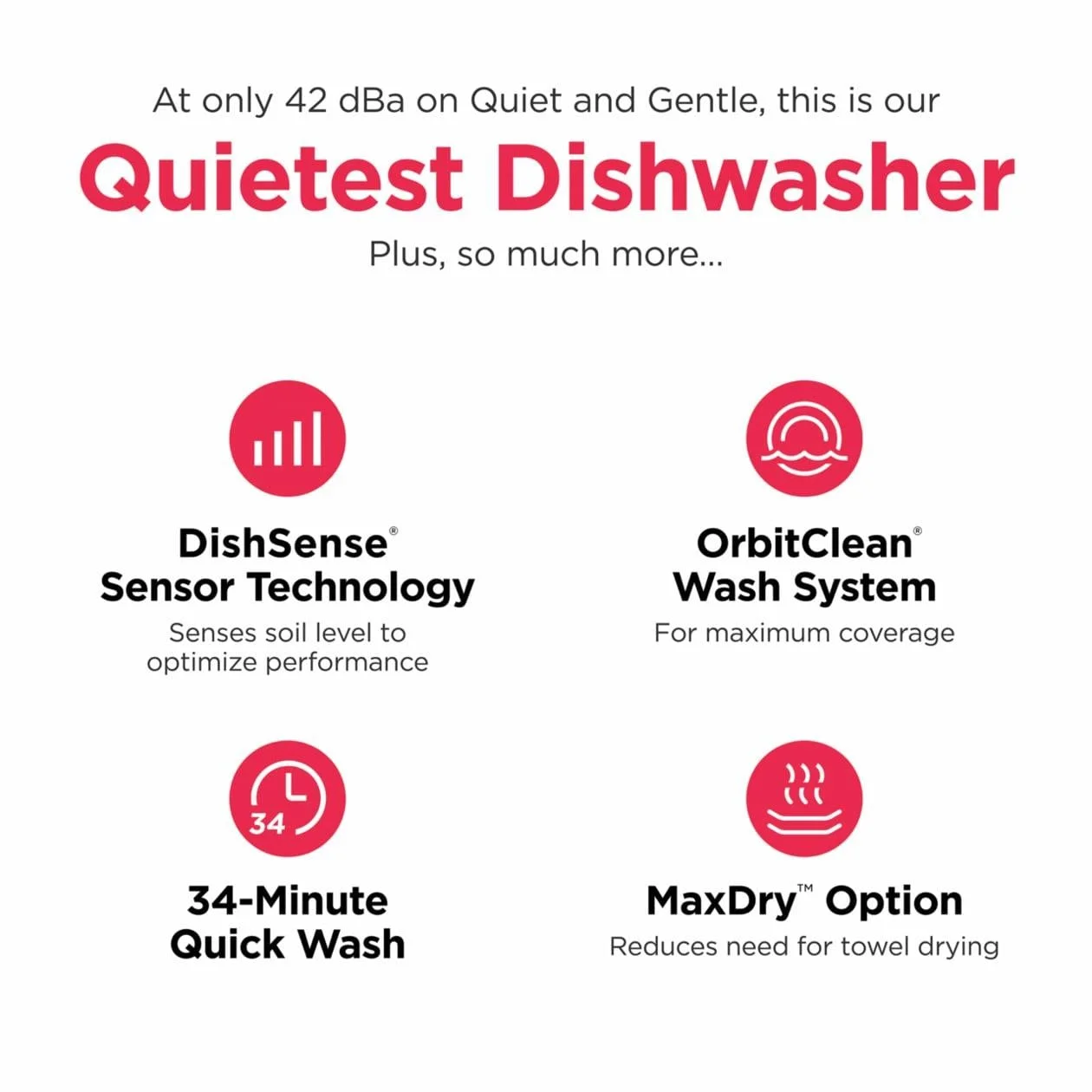 DishSense® Sensor Technology, OrbitClean® Wash System, Quiet as a whisper at 42 dBa, MaxDry™ Option, Sanitize Option, Energy Star® 7.0 Certified, Removable Racks, 34-Minute Quick Wash, Smudge-Proof® Stainless Steel Finish, Stay-Put Door Allows For Easier Loading
