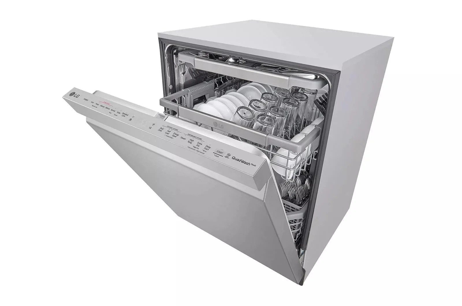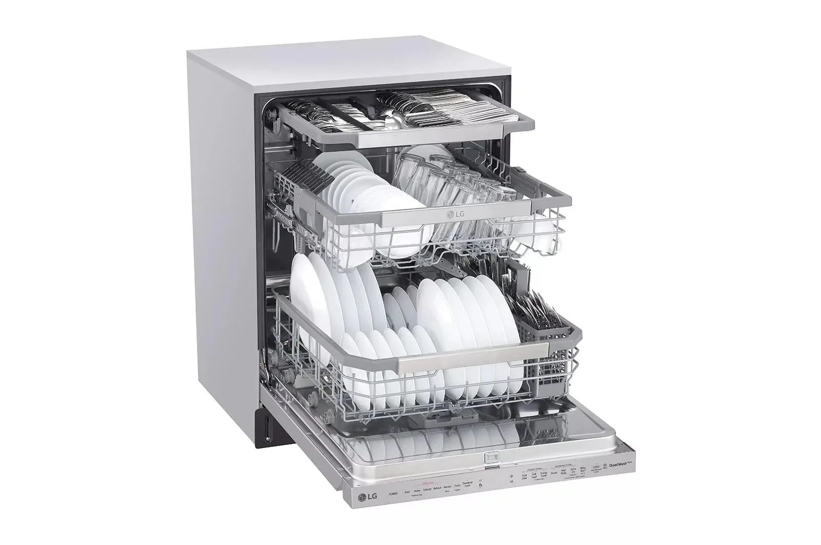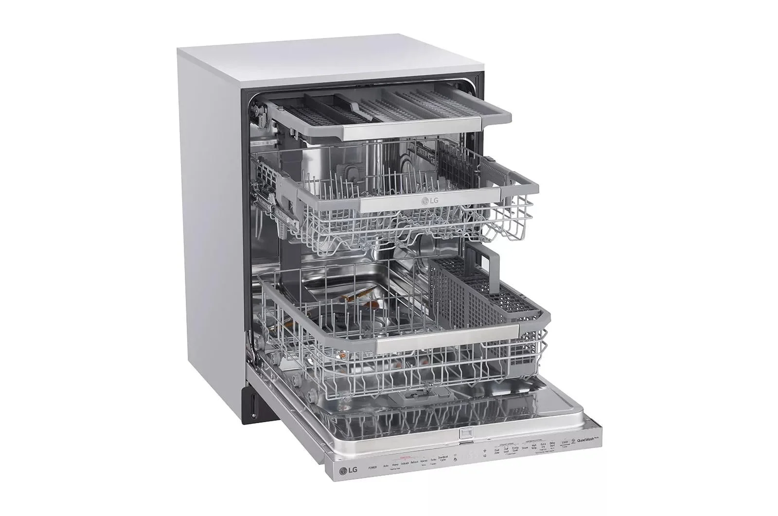 Enjoy a 2-year limited warranty on select appliances purchased through December 31, 2025 via the ThinQ® app. Terms apply., ThinQ Care™ sends proactive usage, maintenance, and diagnostic alerts to your smartphone, With four spray arms instead of just two, QuadWash® technology cleans dishes from multiple angles, TrueSteam®, The height-adjustable 3rd rack provides space to fit everything from long flatware to small cups, Glide Rail ensures the upper rack glides in and out smoothly and evenly every time, PrintProof™ Finish resists smudges and wipes clean with a damp cloth, LoDecibel™ Operation (44dB) is so quiet, you can use your indoor voice