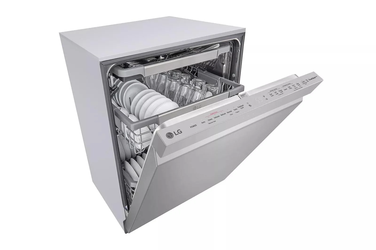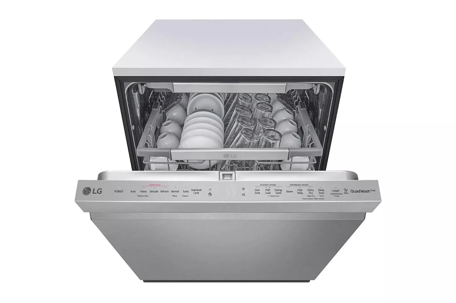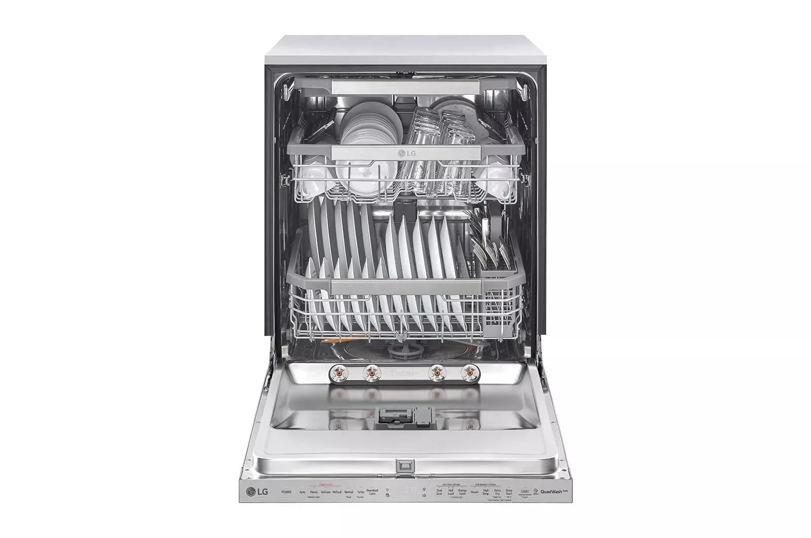 Enjoy a 2-year limited warranty on select appliances purchased through December 31, 2025 via the ThinQ® app. Terms apply., ThinQ Care™ sends proactive usage, maintenance, and diagnostic alerts to your smartphone, With four spray arms instead of just two, QuadWash® technology cleans dishes from multiple angles, TrueSteam®, The height-adjustable 3rd rack provides space to fit everything from long flatware to small cups, Glide Rail ensures the upper rack glides in and out smoothly and evenly every time, PrintProof™ Finish resists smudges and wipes clean with a damp cloth, LoDecibel™ Operation (44dB) is so quiet, you can use your indoor voice