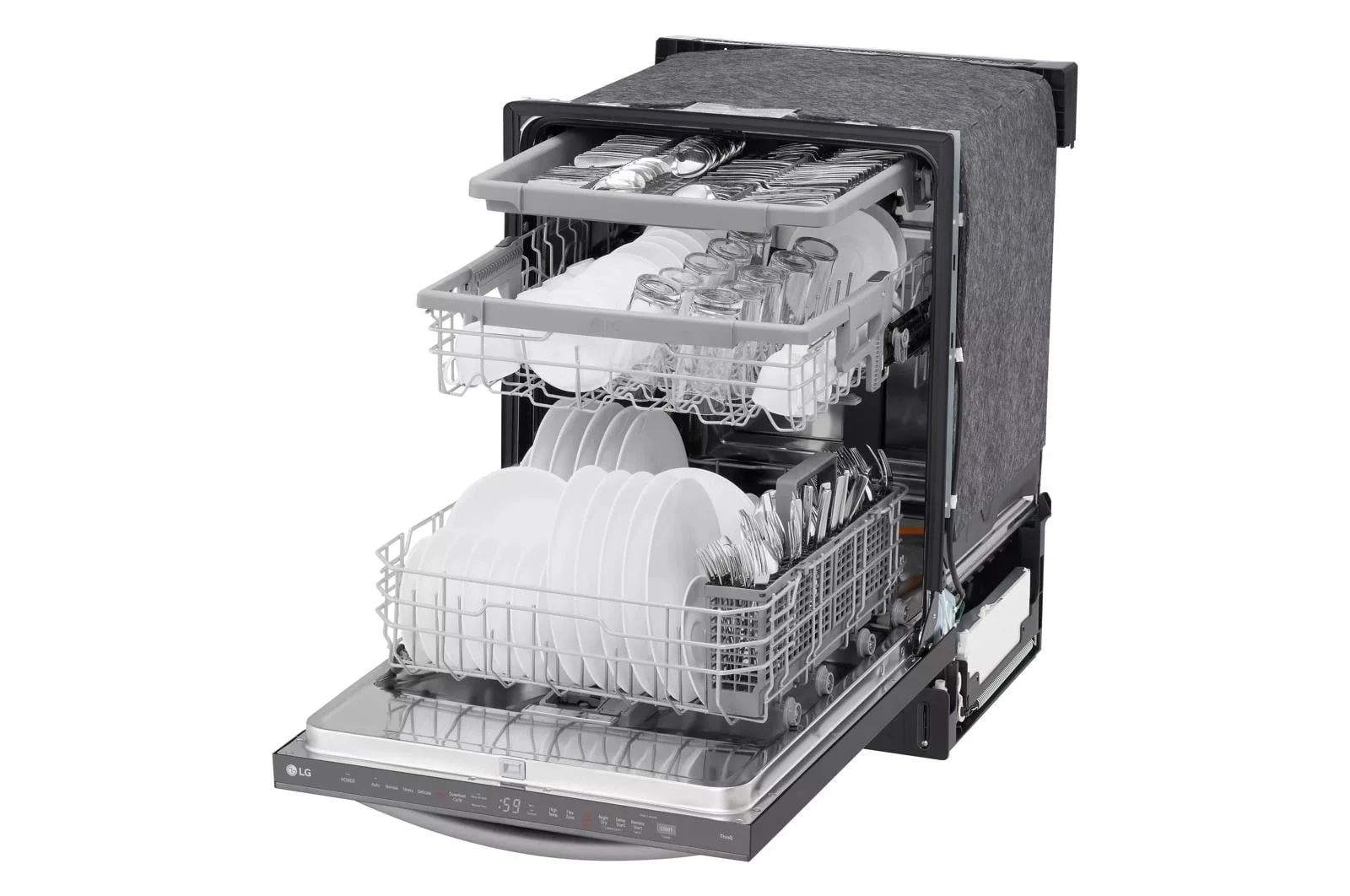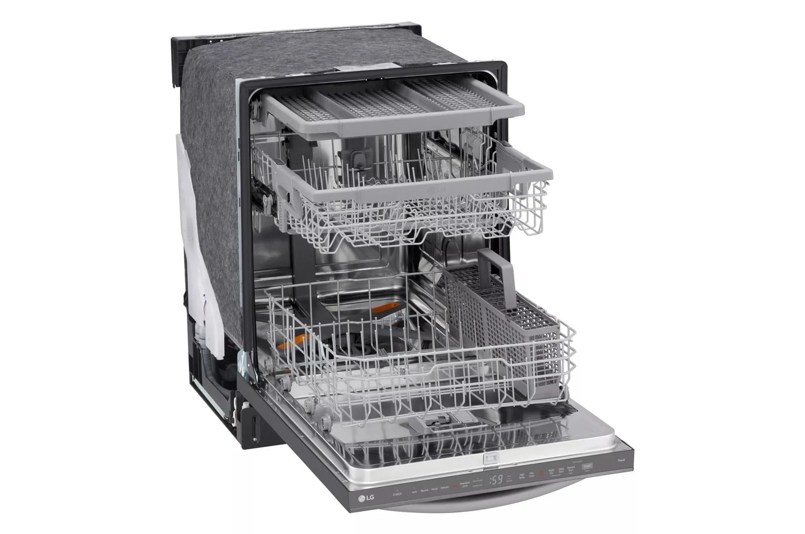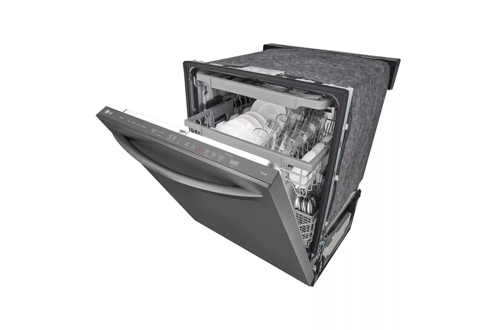 Enjoy a 2-year limited warranty on select appliances purchased through December 31, 2025 via the ThinQ® app. Terms apply., Our leading 1-hour wash and dry cycle gives you sparkling, table-ready dishes in less time, High-pressure jets with 38% more cleaning power, as compared to our standard QuadWash®, Dynamic Heat Dry™ delivers faster, more complete drying that won't melt your plastics, Built In Leak Detection monitors water supply, drainage and drainage and leakage, LoDecibel™ Operation (46 dB) is so quiet, you can use your indoor voice, Save time by fitting more dishes and running fewer loads with EasyRack™ Plus, LG ThinQ® Smart Technology