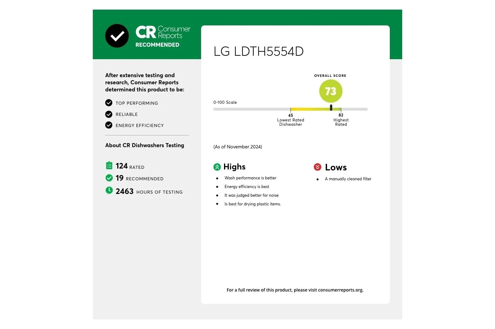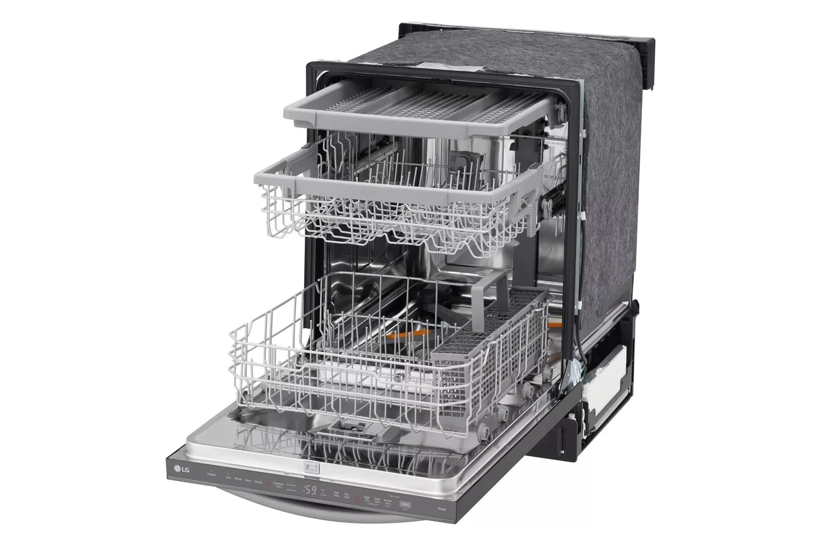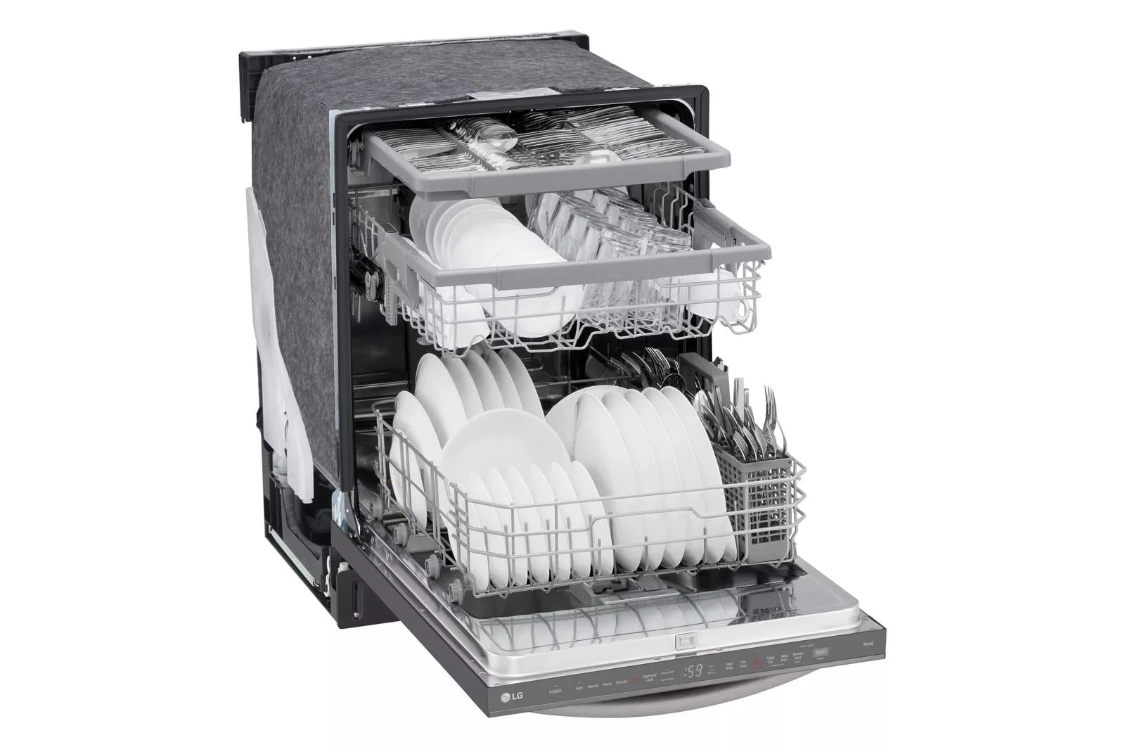 Enjoy a 2-year limited warranty on select appliances purchased through December 31, 2025 via the ThinQ® app. Terms apply., Our leading 1-hour wash and dry cycle gives you sparkling, table-ready dishes in less time, High-pressure jets with 38% more cleaning power, as compared to our standard QuadWash®, Dynamic Heat Dry™ delivers faster, more complete drying that won't melt your plastics, Built In Leak Detection monitors water supply, drainage and drainage and leakage, LoDecibel™ Operation (46 dB) is so quiet, you can use your indoor voice, Save time by fitting more dishes and running fewer loads with EasyRack™ Plus, LG ThinQ® Smart Technology