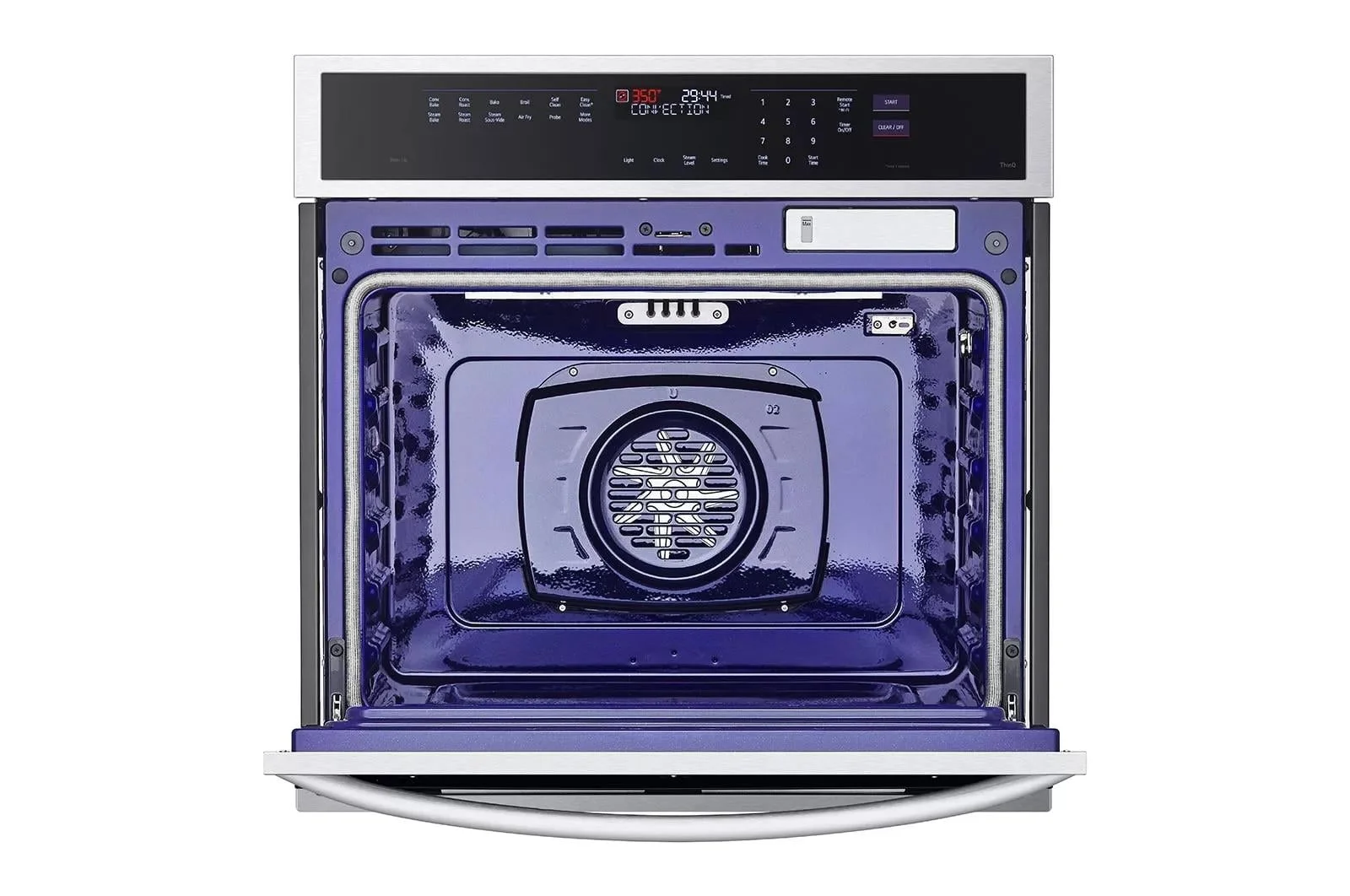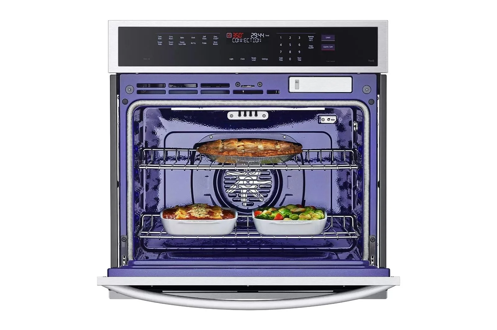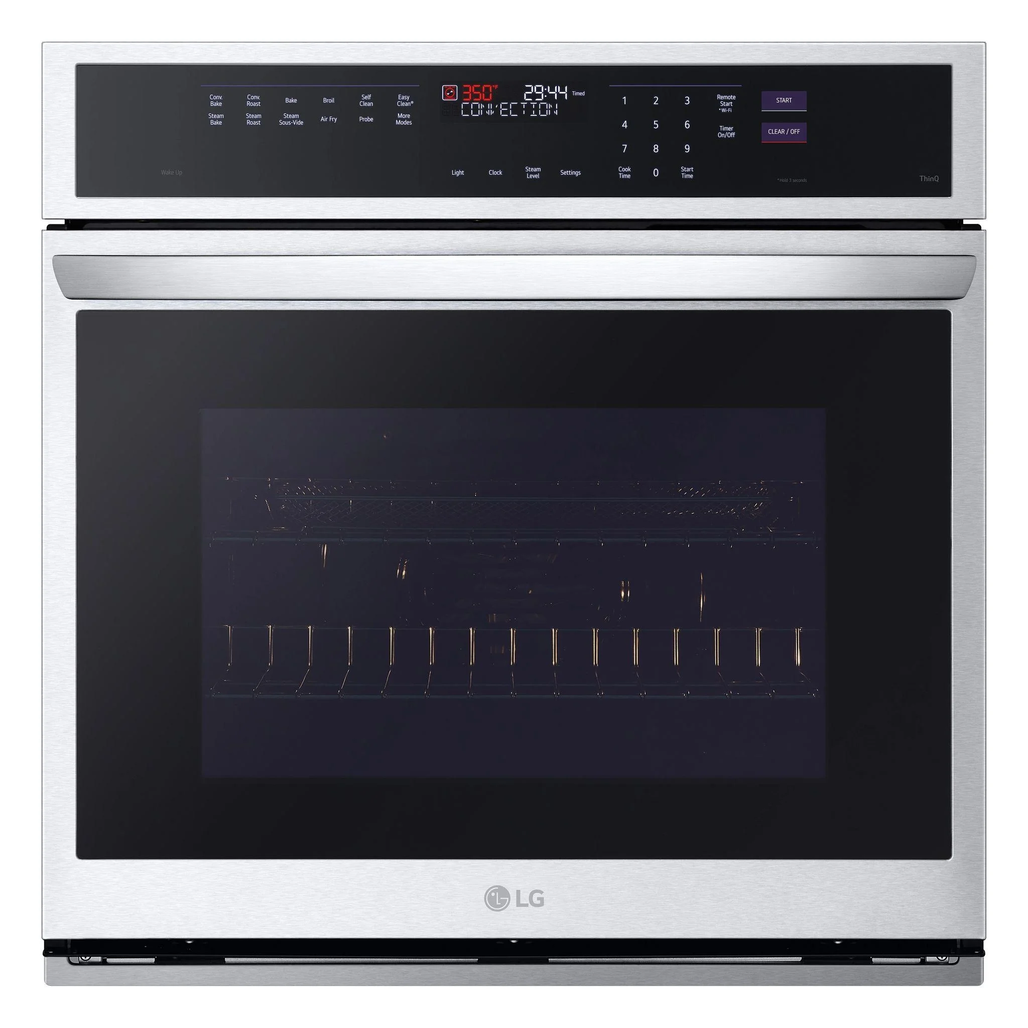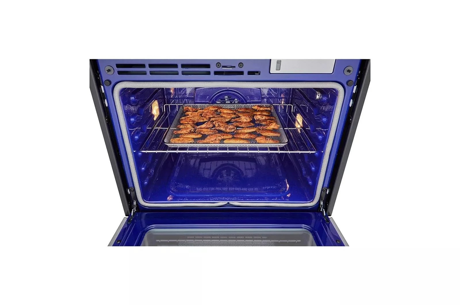 Enjoy a 2-year limited warranty on select appliances purchased through December 31, 2025 via the ThinQ® app. Terms apply., Get the ThinQ® app to access smart features and ThinQ Care™ alerts, True convection delivers more even cooking on every rack plus browned, crispy textures, Enjoy multifunctional versatility with air fry and steam baking, roasting, and steam sous vide, Backlit SmoothTouch® Glass Controls offer high-definition visibility and appear hidden when off, Knock twice on the InstaView® window to see inside, Speed clean your oven with our 10-Minute EasyClean® cycle or use self-clean for a deep clean, Our PrintProof® finish resists fingerprints and smudges and easily wipes clean