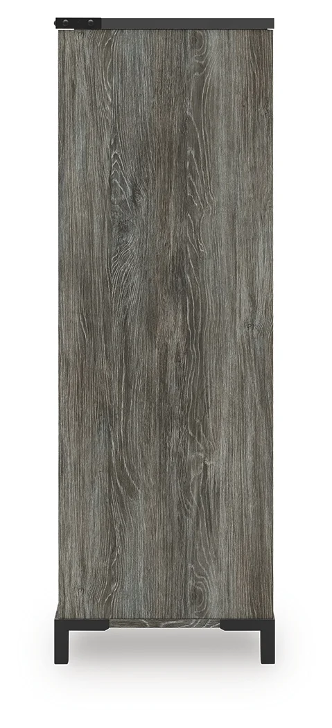 Made with engineered wood (MDF/particleboard/plywood) and decorative laminate for the right balance of affordability and durability, Rustic warm gray finish over replicated oak grain with authentic touch, Decorative laminate replicates natural or man-made material surfaces with consistent color, pattern and texture, Matte black drawer handles, 5 smooth-gliding drawers, 4 shelves behind hinged cabinet, Safety is a top priority, clothing storage units are designed to meet the most current standard for stability, ASTM F 2057 (ASTM International), Drawers extend out to accommodate maximum access to drawer interior while maintaining safety, Minor assembly required
