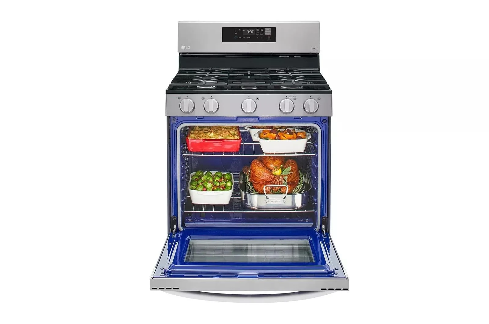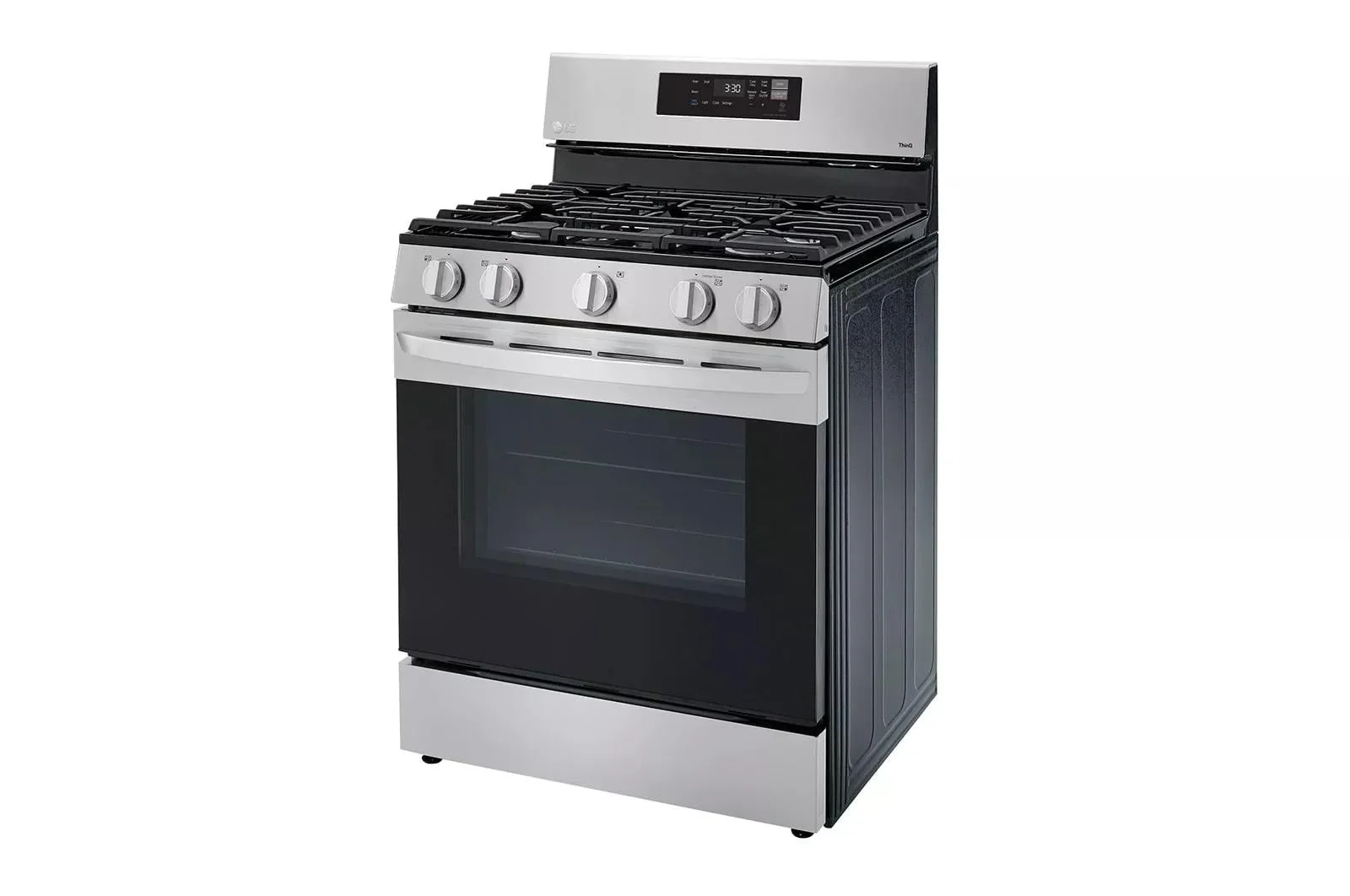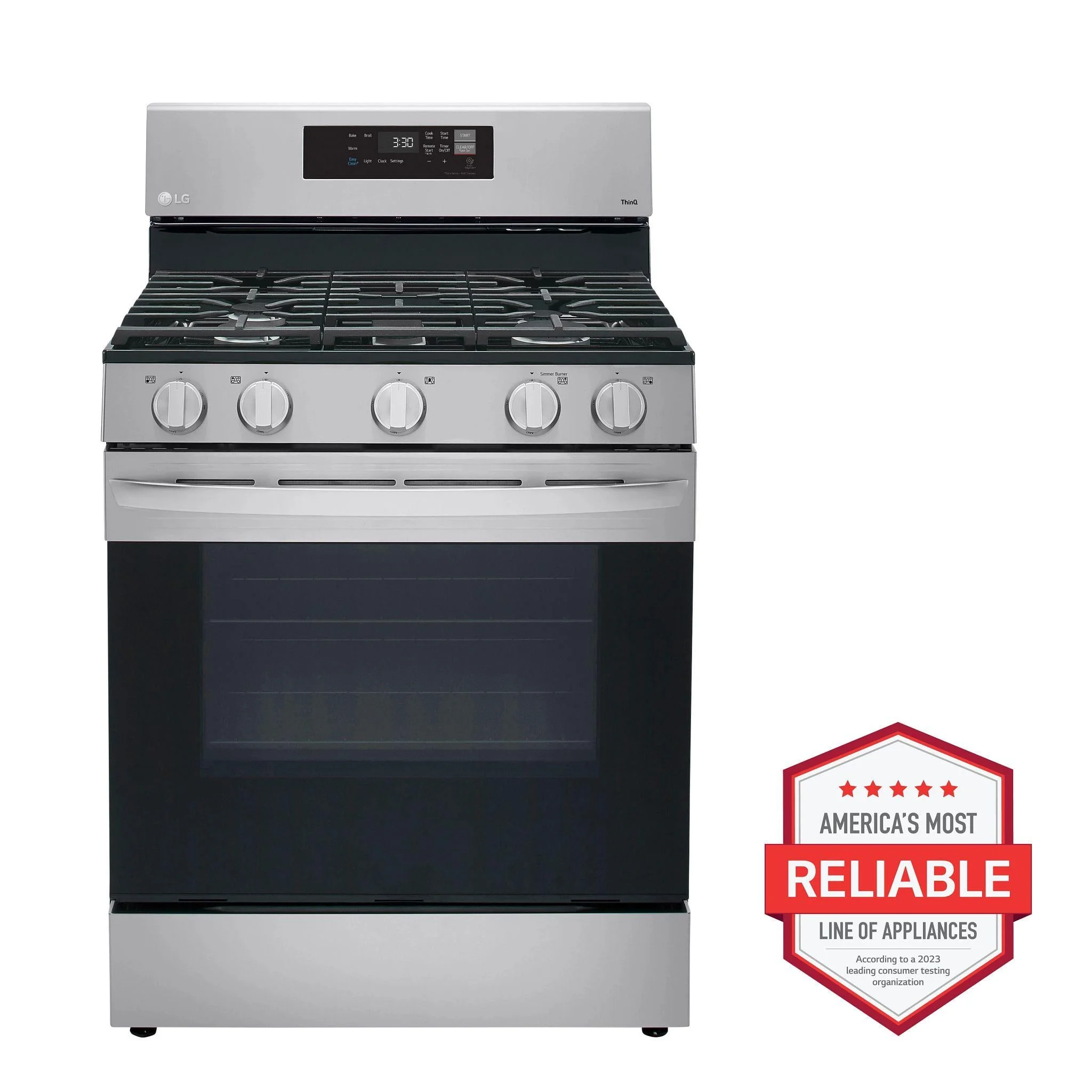Enjoy a 2-year limited warranty on select appliances purchased through December 31, 2025 via the ThinQ® app. Terms apply., Get the ThinQ® app to access smart features and ThinQ Care™ alerts, 5.8 cu ft. Capacity, 5 sealed gas burners for all your cooking needs, Bring liquids to a boil quickly with the powerful Superboil™ 17K BTU burner, Continuous cast iron grates provide even heating and stability for your cookware, Speed clean your oven with our 10-Minute EasyClean® cycle