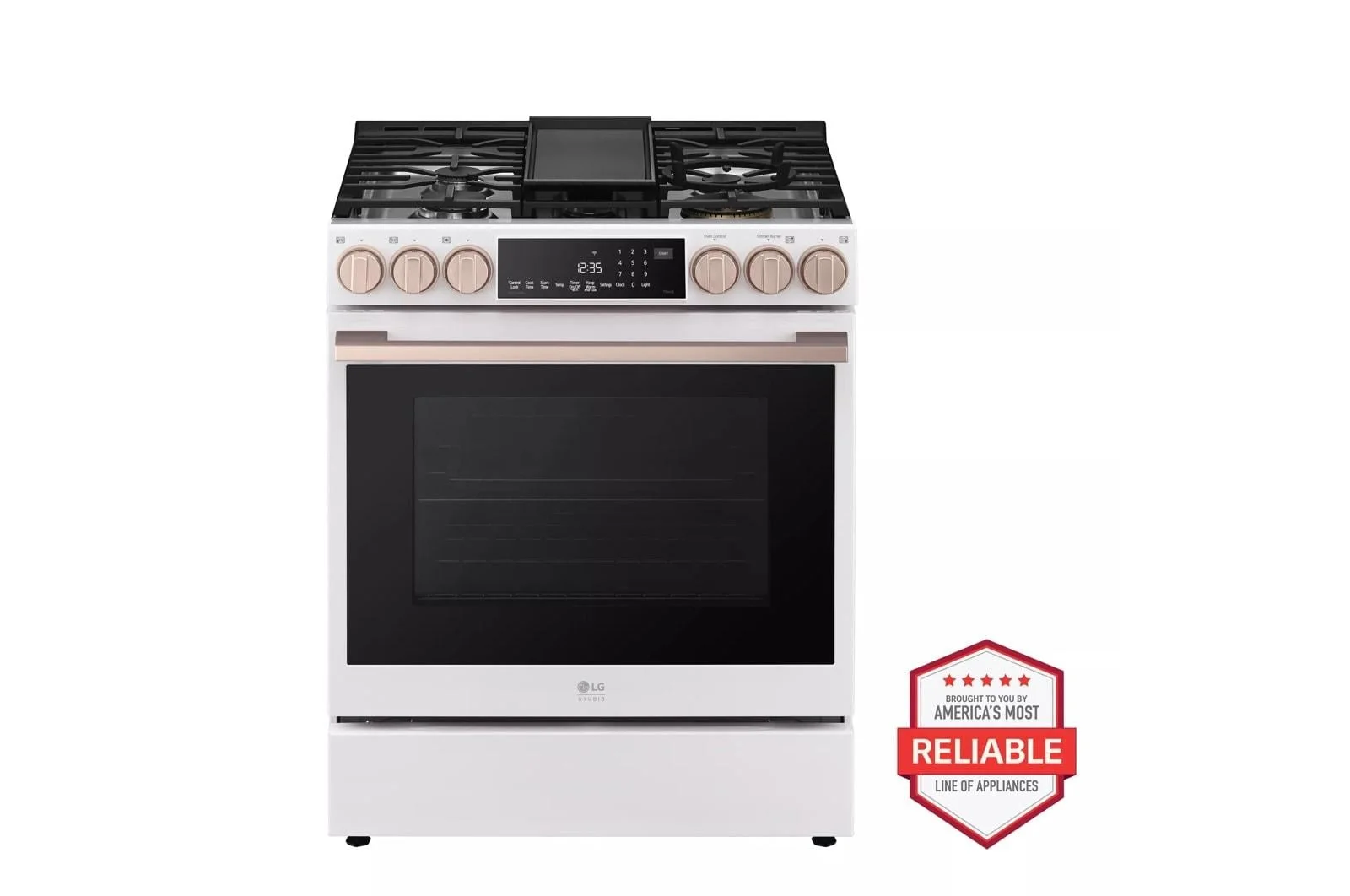 LG STUDIO ThinQ Offer: Enjoy a 3-year limited warranty on select appliances purchased through December 31, 2025 via the ThinQ® app. Terms apply., Essence White line of products delivers a luxurious, unique matte finish that's as bold as you are, Elevated light bronze handles add an elegant accent to your kitchen, 6.3 cu. ft. capacity oven lets you impress with your cooking skills-no matter how big the guest list, InstaView® Window puts the ultimate spotlight on your next big dish, ProBake Convection® with Air Fry & Air Sous Vide let you tap into new creative cooking techniques, EasyClean® + Self Clean Performance make it easy to keep your kitchen looking its best, ThinQ® Technology with ThinQ Care gives extra peace of mind, Disclaimer - Actual product color may vary due to photographic lighting, appliance finish, or computer display settings.