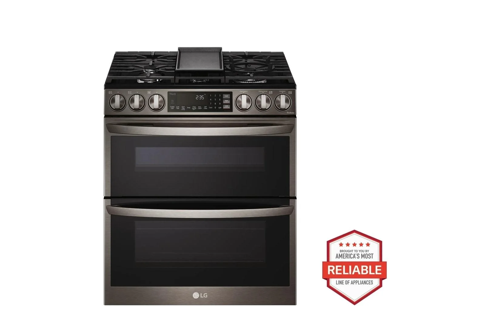 Enjoy a 2-year limited warranty on select appliances purchased through December 31, 2025 via the ThinQ® app. Terms apply., Get the ThinQ® app to access smart features and ThinQ Care™ alerts, UltraHeat™ 22K BTU dual burner for even cooking, rapid boiling, and true simmers, Probake Convection®, our best convection technology for even cooking on multiple racks simultaneously, Enjoy multifunctional versatility with air fry and air sous vide modes, Knock twice on the InstaView® window to see inside, Speed clean your oven with our EasyClean® cycle or use self-clean for a deep clean, Our PrintProof® finish resists fingerprints and smudges and easily wipes clean