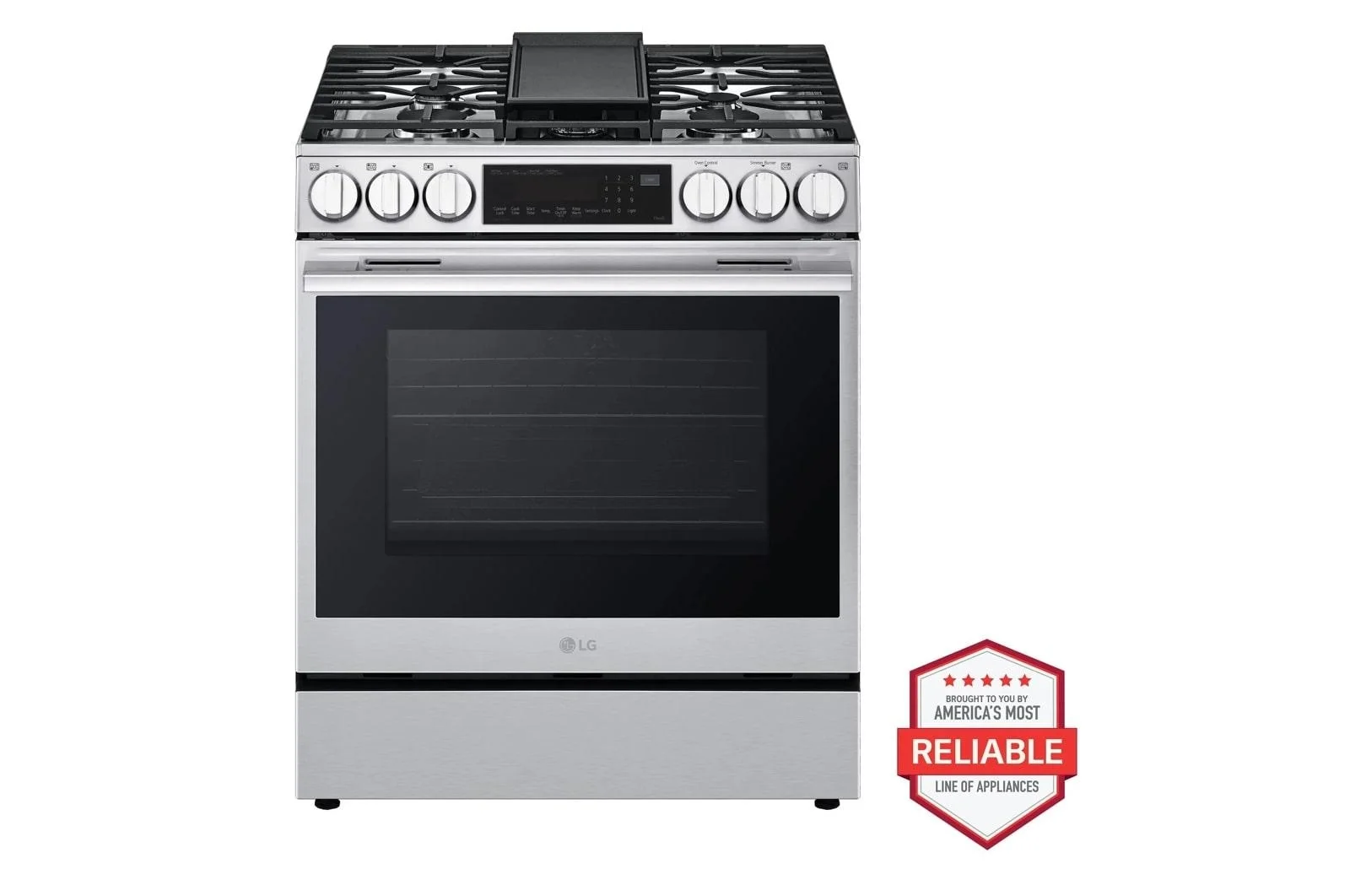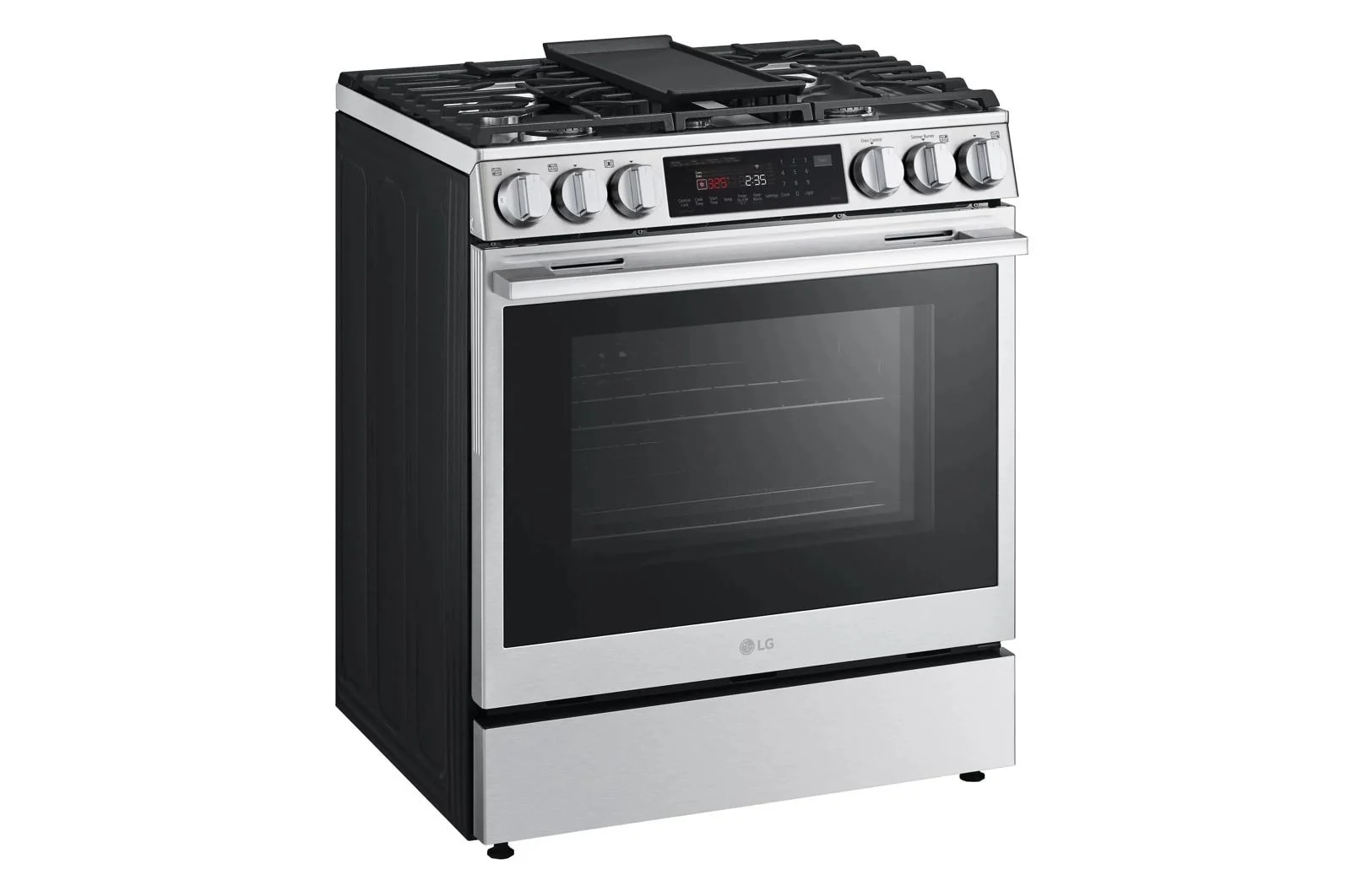 Enjoy a 2-year limited warranty on select appliances purchased through December 31, 2025 via the ThinQ® app. Terms apply., This 6.3 cu. ft. range has generous capacity so you can cook for one, or cook for all, Restyled bar handles deliver premium style, Easily wipe away splatters with the coated surface of LG's EasyClean® stainless steel cooktop, The wide grate design of this LG gas range has room to use for pans of all shapes and sizes, The removable cast-iron griddle is perfect for pancakes, eggs and bacon, tortillas and more, LG's UltraHeat™ 20,000 BTU burner boils water and other liquids fast, Get the ThinQ® app to access smart features and ThinQ Care™ alerts