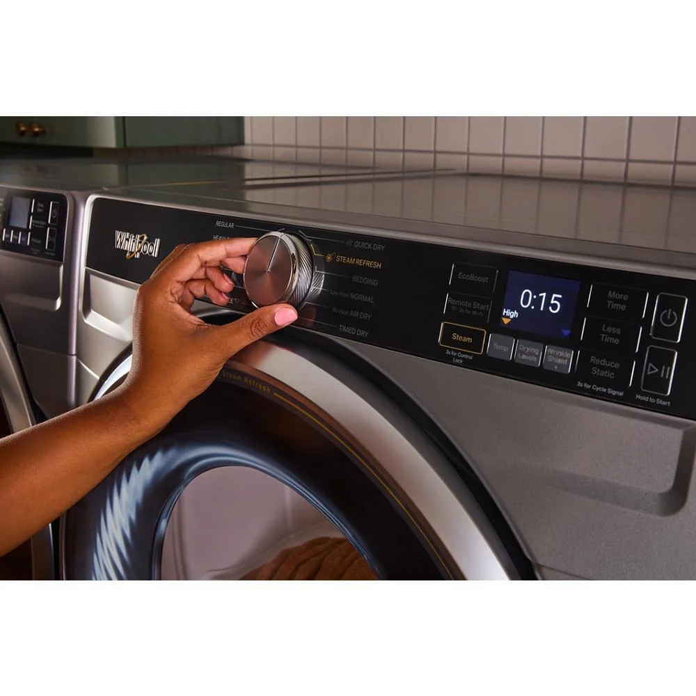 moreRelease wrinkles without rewashing using the Steam Refresh Cycle in this front load gas dryer. It has smart features like AI sensors that automatically adjust dry time, and remote control with the Whirlpool® App. Plus you can finish laundry day in under 1hr by pairing the 25 minute Quick Wash cycle on the matching washer with the 30 minute timed dry.* *Based on a 10-lb load on medium heat.