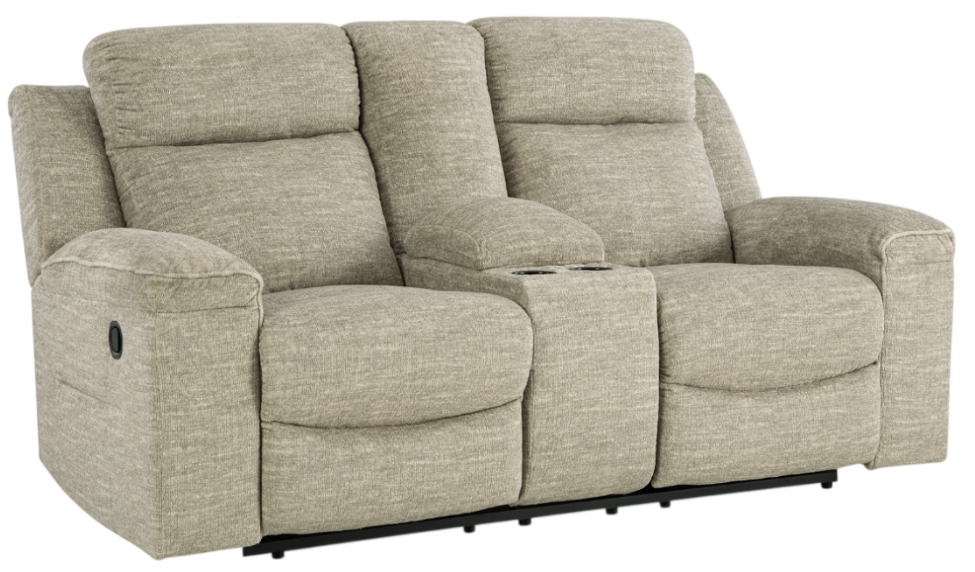 Cozy up in contemporary style. With super-plush fabric and padded arms, this reclining loveseat with console levels up your day-to-day lounging. Sit back and relax with a simple pull tab motion. Thanks to this loveseat's inviting neutral hue, you have the flexibility to pair it with a variety of styles and colors.Read More