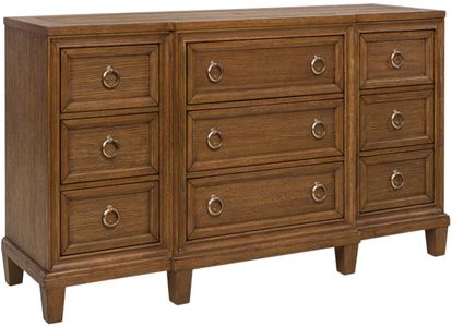 This striking dresser looks equally at home in traditional or modern settings. A brown wood tone finish offers a casual modern look. Spacious drawers incorporate picture frame moulding and champagne goldtone pulls for a clean yet sophisticated design. Combined with the top's chic inset metal frame, it's a wonderful style awakening in the bedroom.Read More