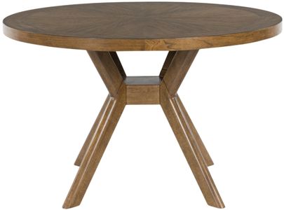 Introducing this stylish and practical round dining table. Its sunburst inlay patterned top and eye-catching geometric legs create a unique gathering experience. The sleek design allows the natural beauty of the wood to shine through. With this mid-century modern table, dining with friends and family has never been easier.Read More