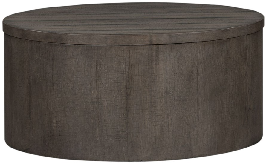 Elevate your space with the Modern Farmhouse drum cocktail table. Crafted of poplar solids with knotty white oak veneers, this piece features a dusty charcoal finish with heavy distressing, an appealing high-low planked top, and casters for easy moveability.Read More