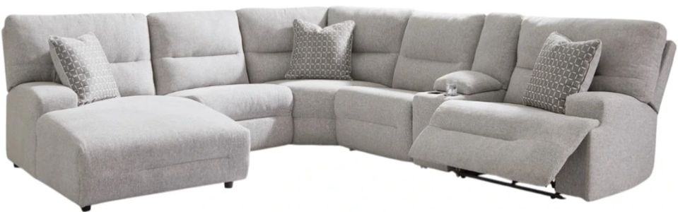 Includes left-arm facing power reclining back chaise, power armless recliner, armless chair, console with storage, wedge and right-arm facing power recliner