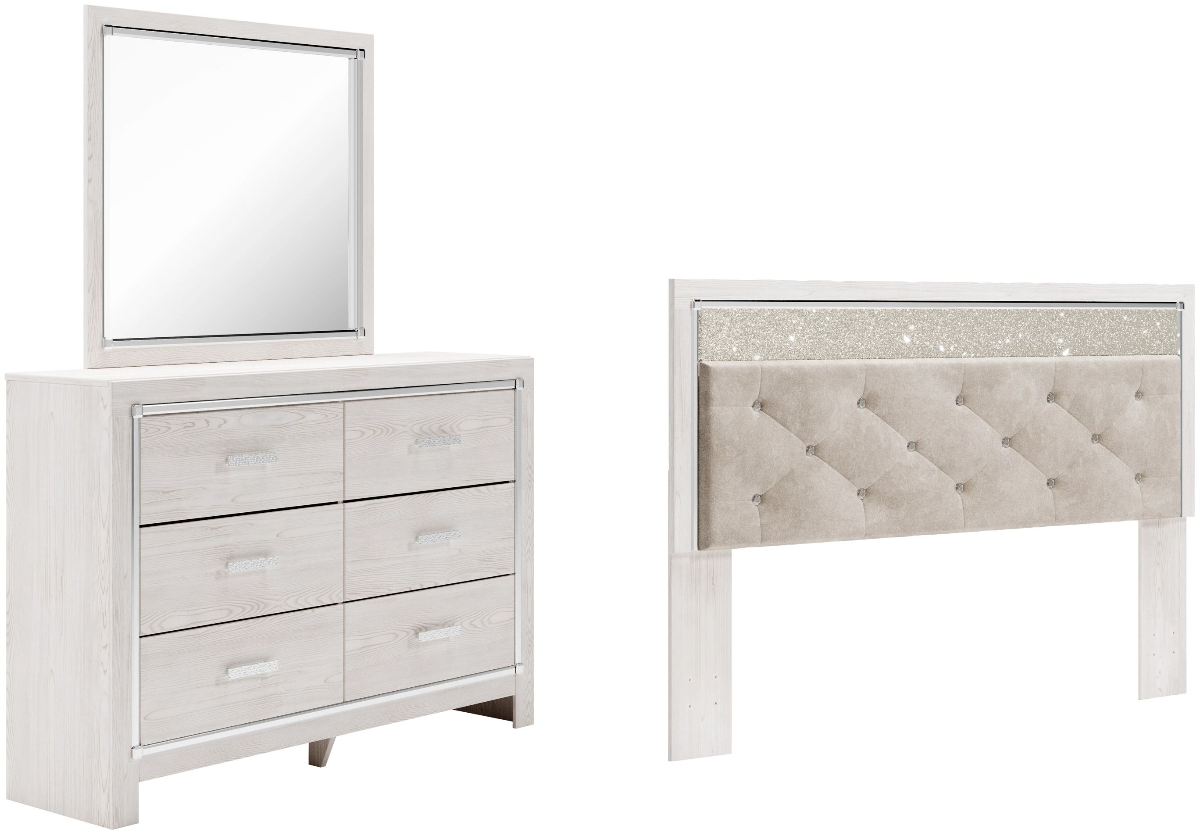 Includes California king/king upholstered panel headboard and 6-drawer dresser with mirror