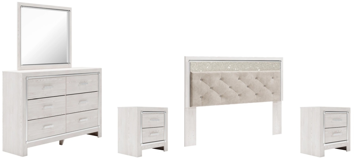 Includes California king/king upholstered panel headboard, 6-drawer dresser with mirror and two 2-drawer nightstands