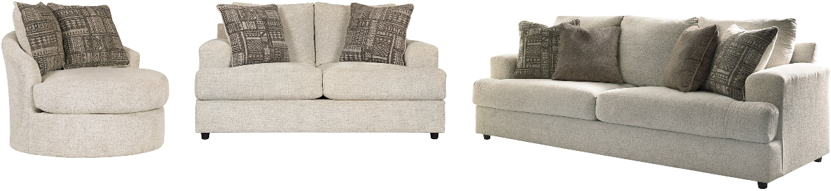Flaunting a trendsetting silhouette, this sofa, loveseat and swivel accent chair put the contemporary in your contemporary home. The sofa and loveseat’s “three over two” profile eliminates the center seat cushion, giving you elongated plushness and deep seating.Read More